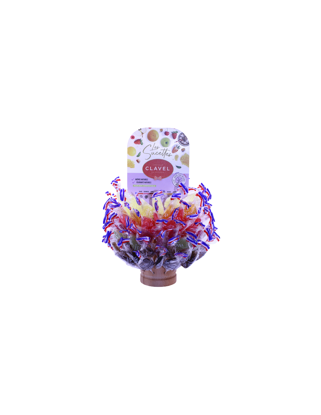 Un assortiments de sucettes sain et colorés. Dans une démarche environnementale, nos sucettes sont élaborées à partir d'arômes naturels et de colorants végétaux.